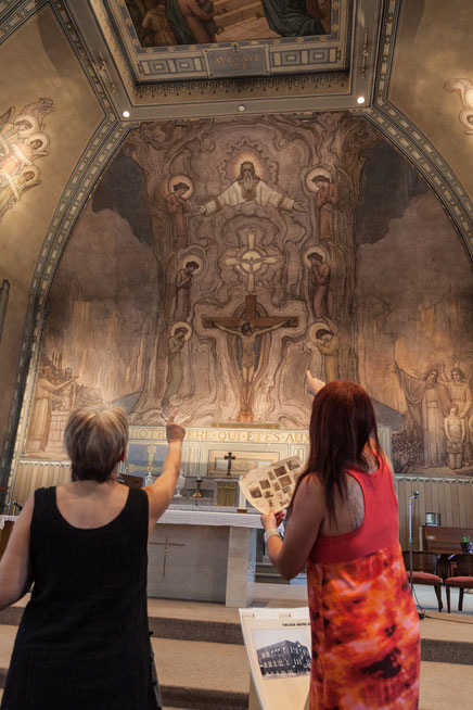 C'est en 1941 qu'Arthur Jacob, curé de l'époque, entreprend des démarches afin de trouver l'artiste qui sera à même de réaliser son rêve: la décoration de son église, alors quasi dépouillée de tout ornement. Il veut offrir à ses paroissiens une église qui inspirera davantage à la prière et au recueillement. Ses recherches le conduiront vers le peintre Ozias Leduc, figure dominante de la peinture sacrée au Canada. De 1942 à 1955, accompagné de ses assistants, Honorius Leduc et Gabrielle Messier, il réalisera un décor composé de 15 peintures marouflées aux dimensions imposantes et aux couleurs douces et apaisantes. Il agrémentera le tout de motifs décoratifs qui unifieront cet ensemble composé d’œuvres sacrées mais aussi de six scènes aux allures profanes qui relatent le passage des bâtisseurs de la Mauricie.